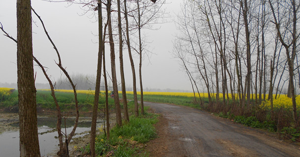 阴阴的雨让人觉得不快时,猛得发现这乡村别有一番春意:一条不宽的小路边竟是大片大片的油菜花,金灿灿得,十分惹人喜爱,旁边还孤零零的树干霎时也变得富有春意了,更引人眼球的是好多的蜂箱,蜂家已经开始卖春天的油菜蜜了。春天真得来了!